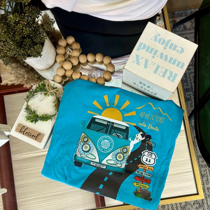 Hit the road in style with our Adventure into Dade Tee! This cute and comfy teal-colored tee features a fun graphic of a vintage van cruising along a scenic road, complete with a road sign pointing to the must-visit spots around Dade. Whether you're a local explorer or just passing through, this tee is perfect for road trip lovers and adventure seekers alike. Pair it with your favorite denim or leggings for an effortlessly cool, travel-ready look!
