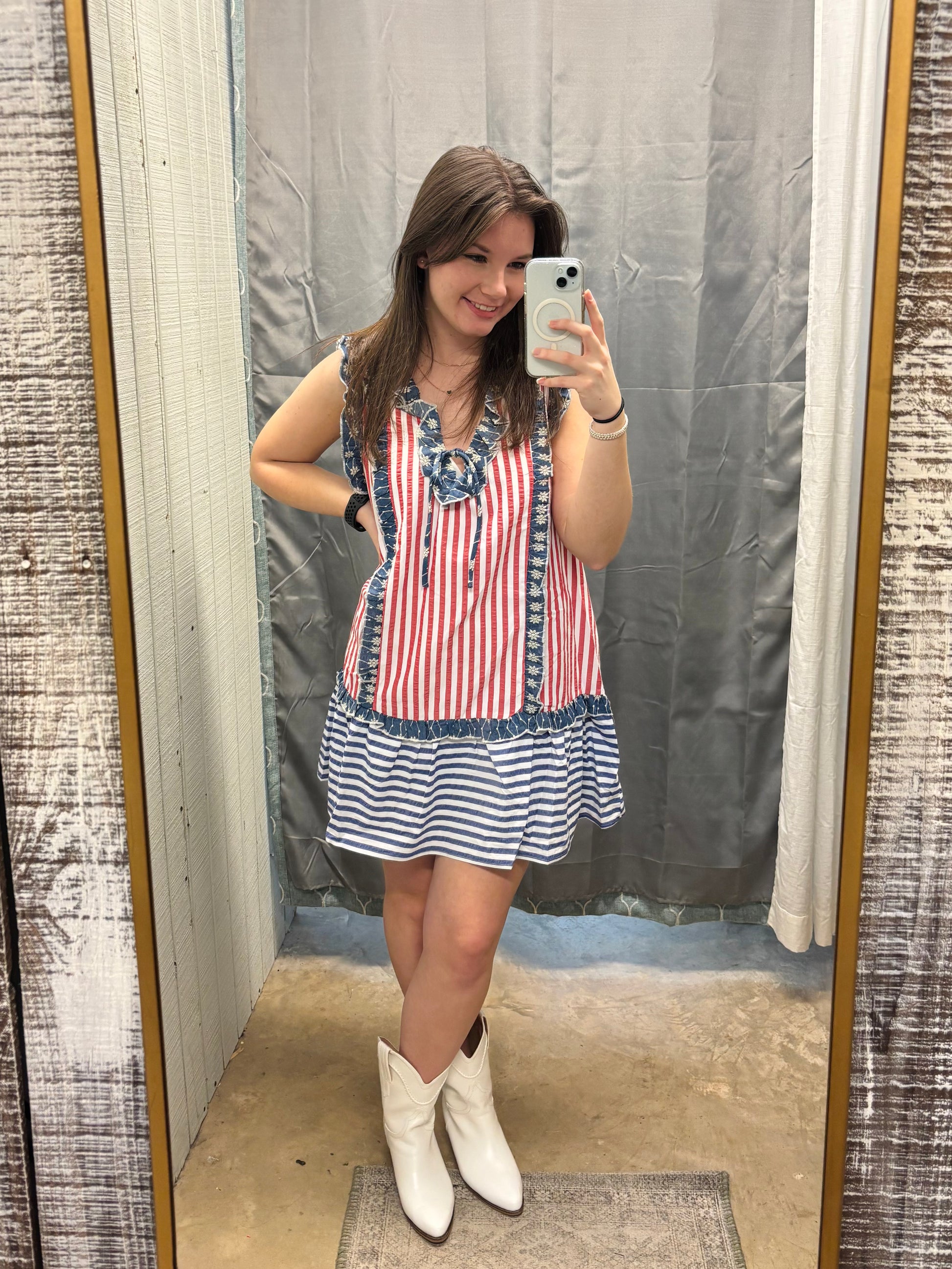 Celebrate summer in style with our All-American Charm Sleeveless Dress, a sweet and spirited standout from our Americana Collection. This stars-and-stripes stunner features a flattering sleeveless silhouette, playful red-and-white stripes, and an eye-catching embroidered star collar for just the right touch of patriotic flair. A darling navy bow ties the look together, making it perfect for Memorial Day, Fourth of July festivities, or any sunny day you want to show off your American pride.