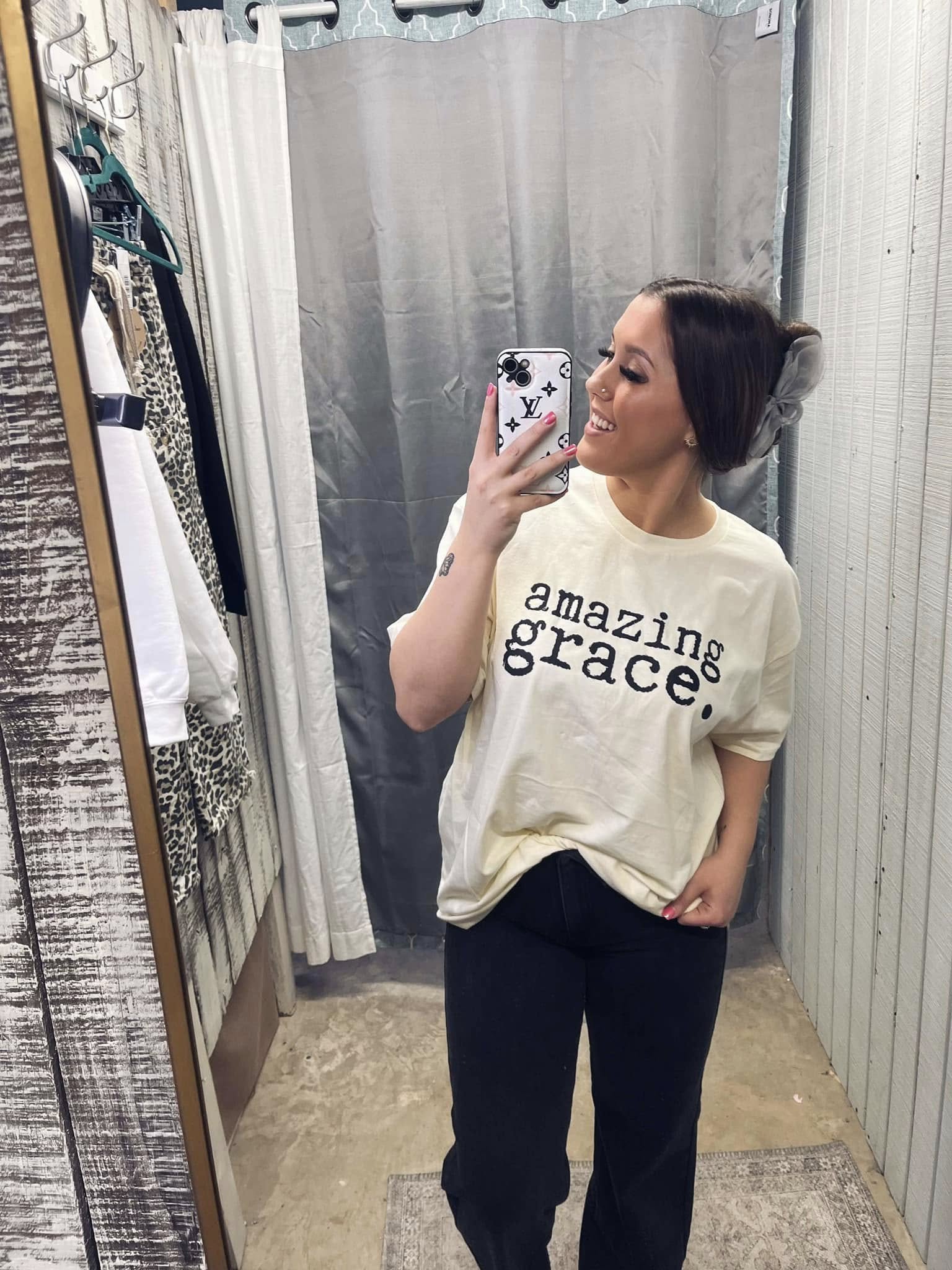 Brighten your day with this cheerful Gildan tee! Made from soft, breathable fabric, this yellowish-cream shirt is the perfect blend of comfort and style. Featuring the timeless phrase "Amazing Grace" in a vintage typewriter font, it brings a touch of classic charm with a modern twist. Whether you're dressing it up or keeping it casual, this shirt is sure to bring a smile to your face and a little extra joy to your wardrobe. Wear it as a reminder of grace and positivity wherever you go!