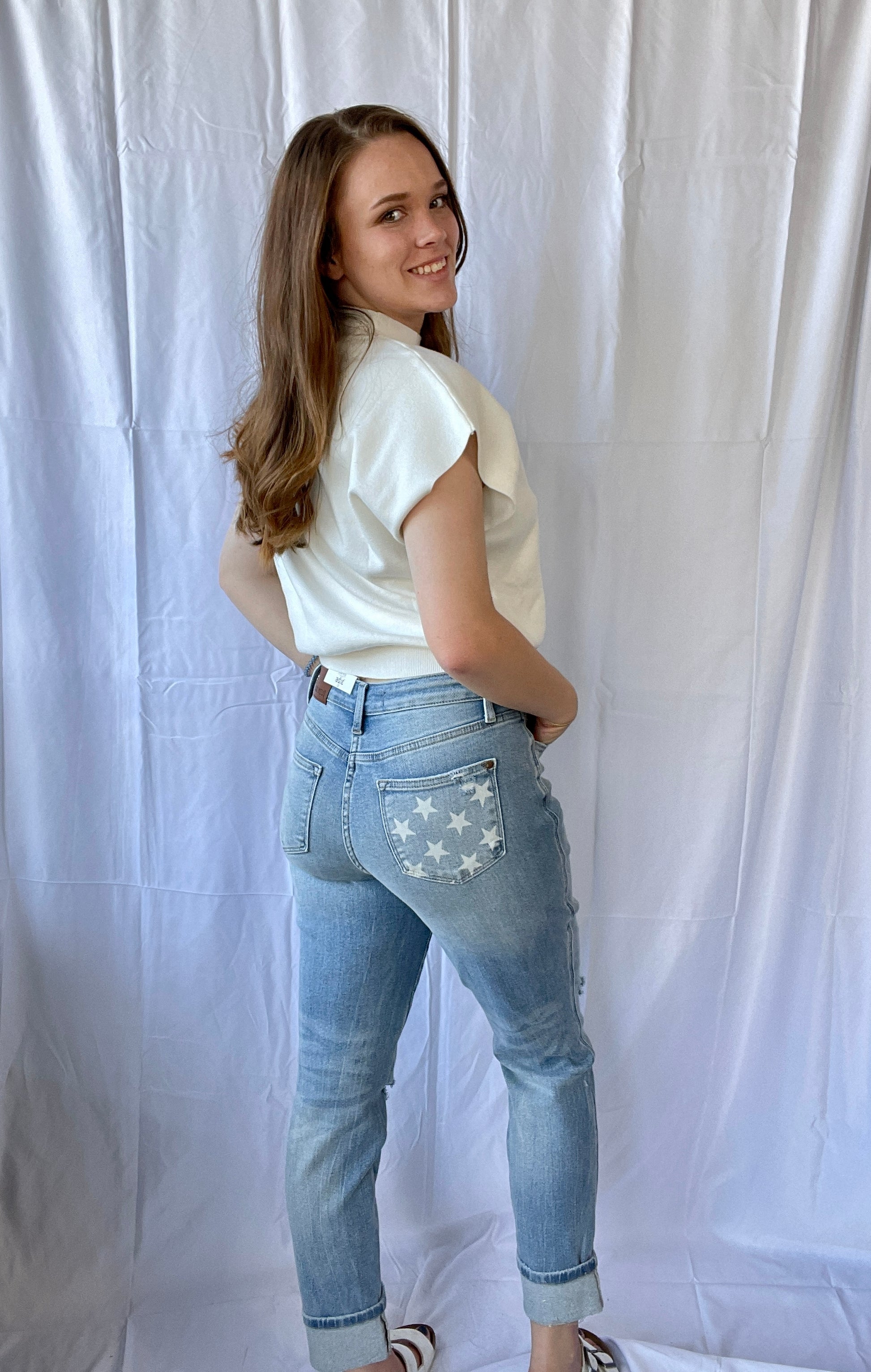 Get ready to show off your Americana pride with these JB Denim jeans. With a comfortable mid-rise fit, these boyfriend jeans feature an Americana flag cuff for added flair. The front rise of 10.25" and a versatile inseam of 28" or 31" (when cuffed or uncuffed, respectively) make these jeans a perfect choice for any occasion.