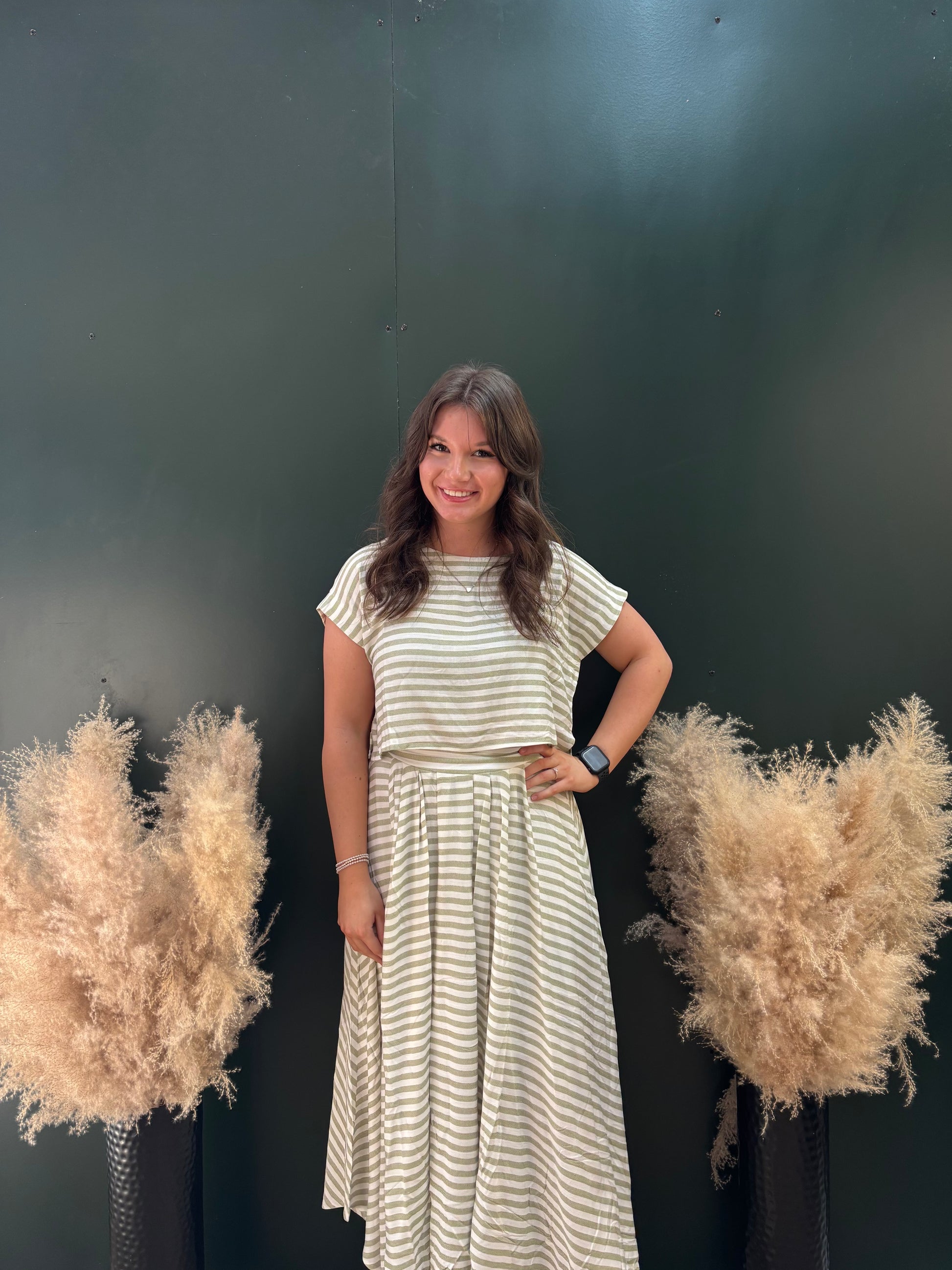 Fresh, free-spirited, and effortlessly chic — the Boho Grove Two-Piece is made for sun-soaked days and wanderlust moments. This matching set features a breezy, cropped top and flowy skirt in earthy green stripes that channel laid-back boho vibes. The lightweight fabric drapes beautifully, while the coordinated look offers endless styling options. Wear it together for an easy outfit or mix and match for versatile bohemian flair.