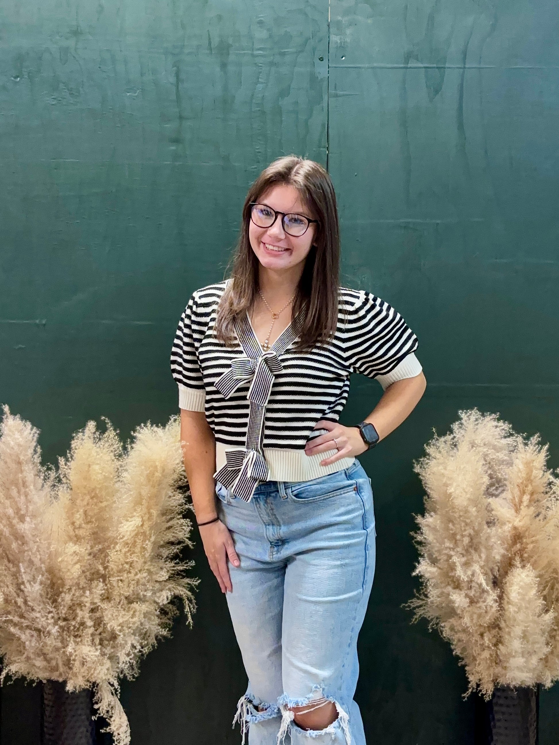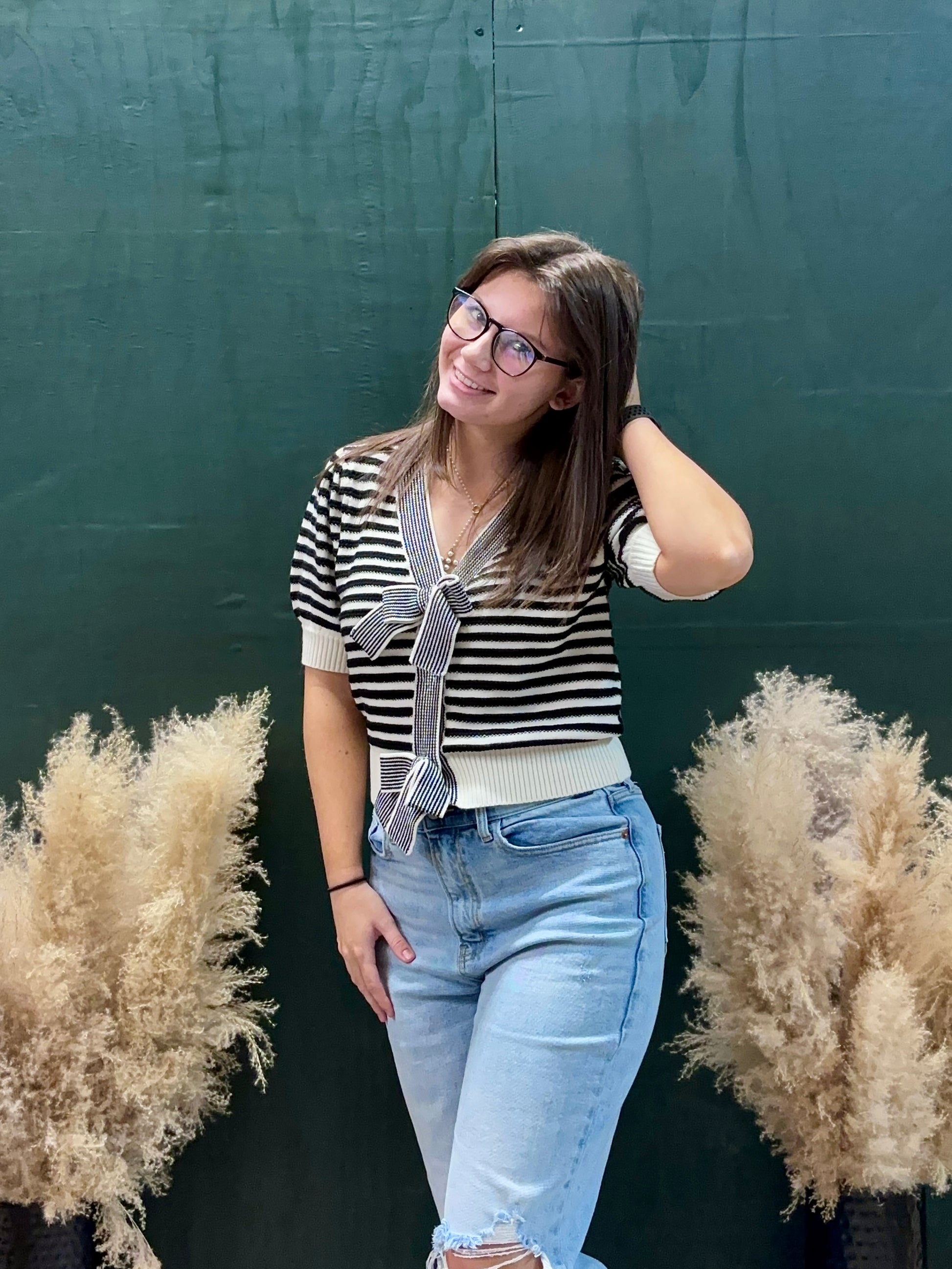 Say hello to your new favorite statement piece! The Bonjour, Darling! top is all things chic with a playful twist. Featuring bold black-and-white stripes, feminine puff sleeves, and not one-but two- adorable bow accents, this knit is made to turn heads. The cropped fit pairs perfectly with high rise shorts, denim, or your favorite midi skirt. Whether you're brunching with the girls or strolling downtown, this top says "effortlessly cute" in every language.