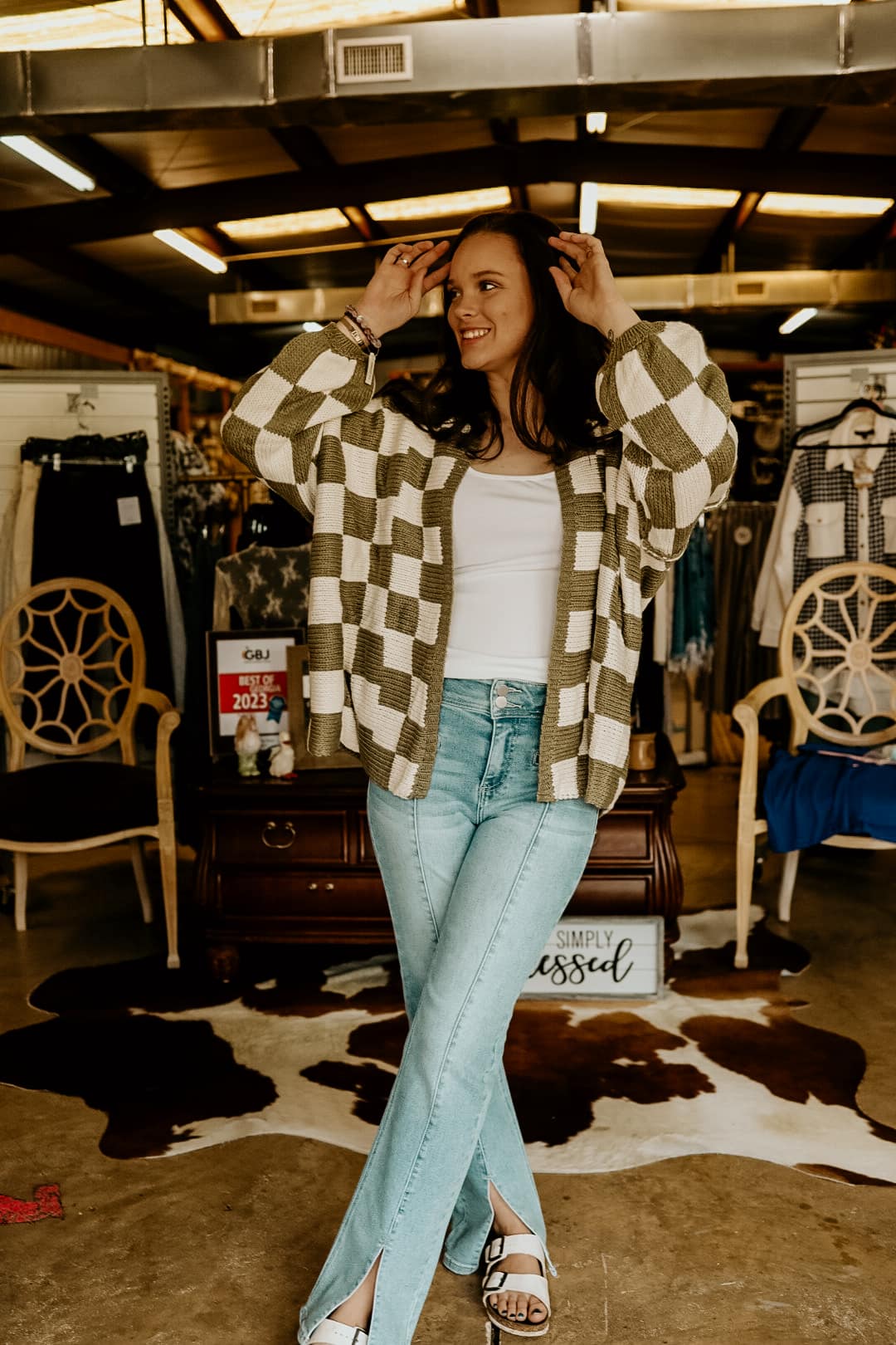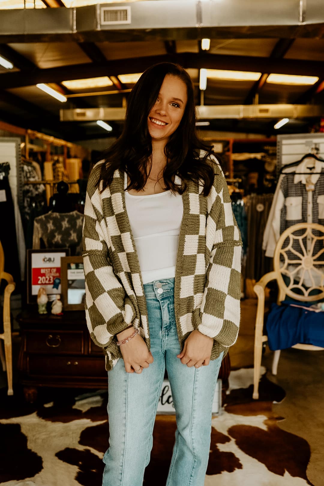 Step up your style game with the Checker Chic Knit Cardigan—a bold and cozy statement piece that blends classic charm with contemporary flair. This eye-catching cardigan features a striking checkerboard pattern in rich olive green and creamy beige, creating a visually dynamic and effortlessly stylish look.