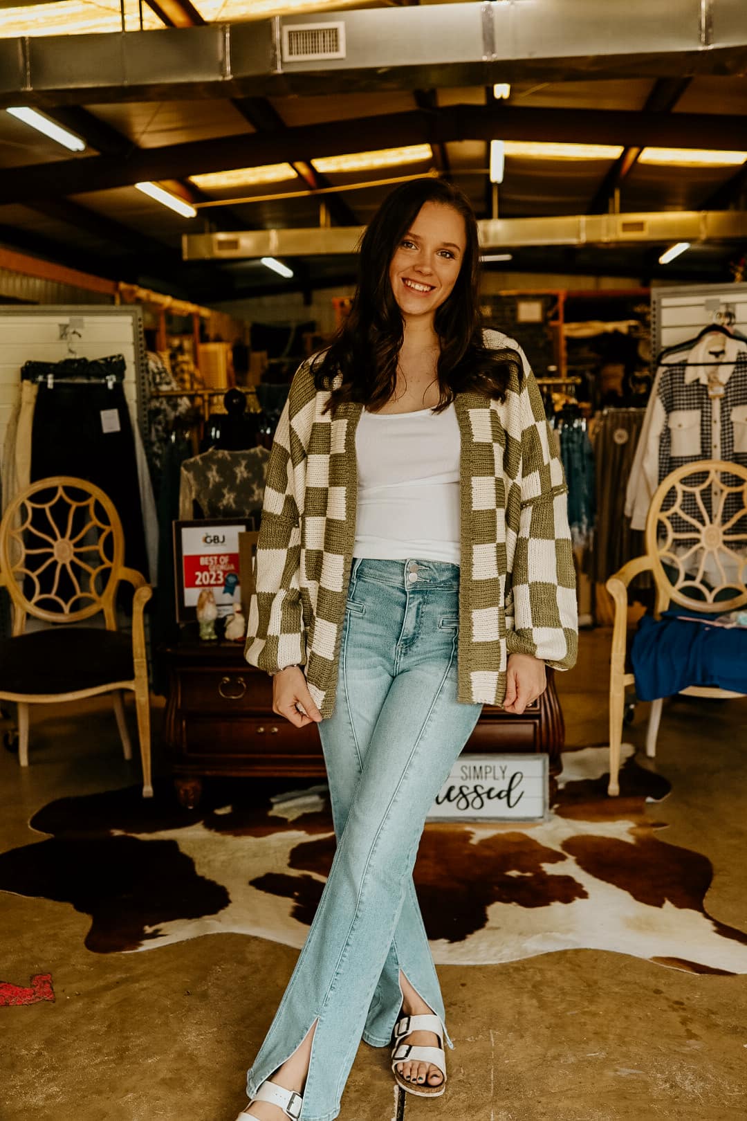 Crafted from a soft, high-quality knit, the Checker Chic Cardigan offers both warmth and comfort, making it a versatile addition to your wardrobe. Its relaxed fit and cozy fabric make it perfect for layering over everything from casual tees to dressier tops, while the checkerboard pattern adds a touch of playful sophistication.