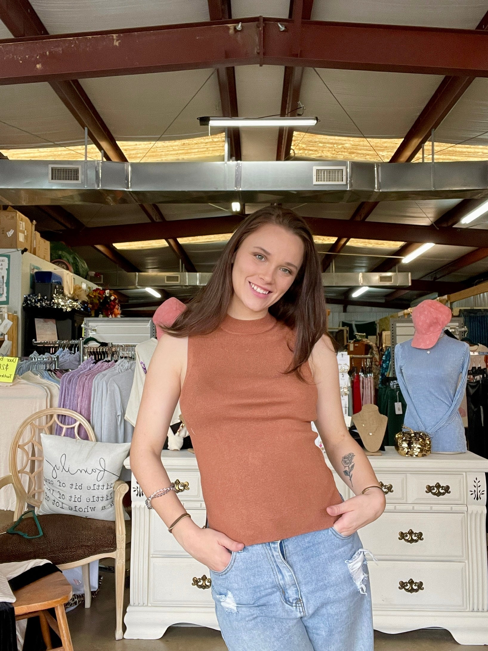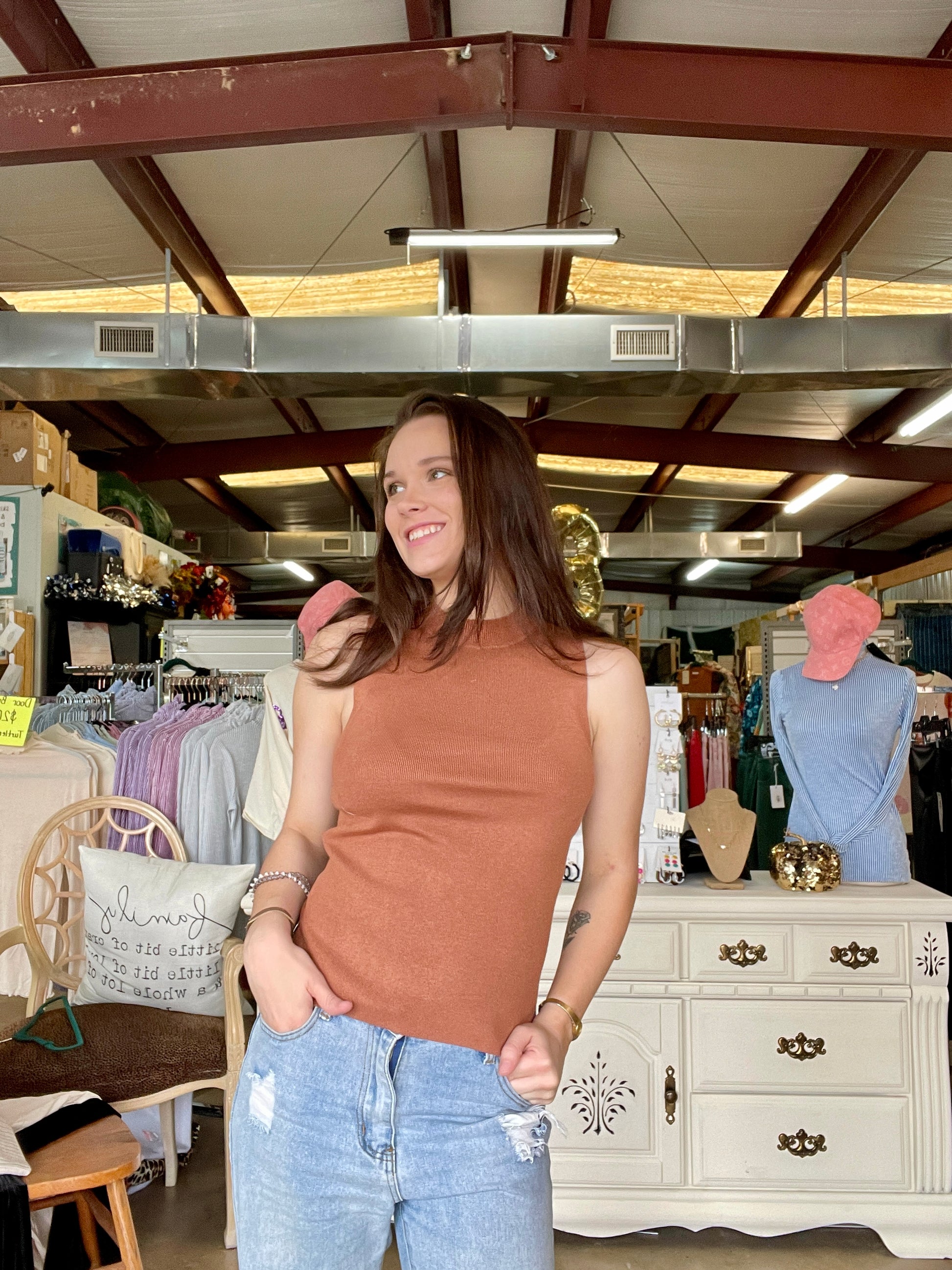 Rock the Clay Mock Tank for a chic, fitted look. Its knit fabric and mock neck add an extra touch of comfort and style. Perfect for any occasion, this tank is sure to elevate your wardrobe.
