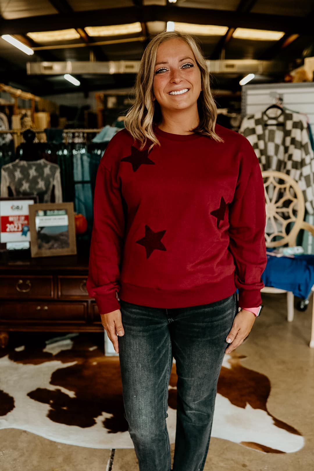 Unveil the enchantment of the Crimson Magic Crewneck, where timeless elegance meets celestial charm. This stunning maroon crewneck sweater is adorned with embossed stars, adding a touch of whimsy and wonder to your everyday wardrobe.