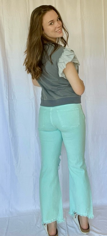 This top is a must-have for any fashion-forward individual. With its solid crew neck and playful striped print ruffle shoulder, you'll be sure to turn heads. Plus, the ribbed hemline adds a touch of sophistication to any outfit. Don't miss out on this quirky and stylish piece!