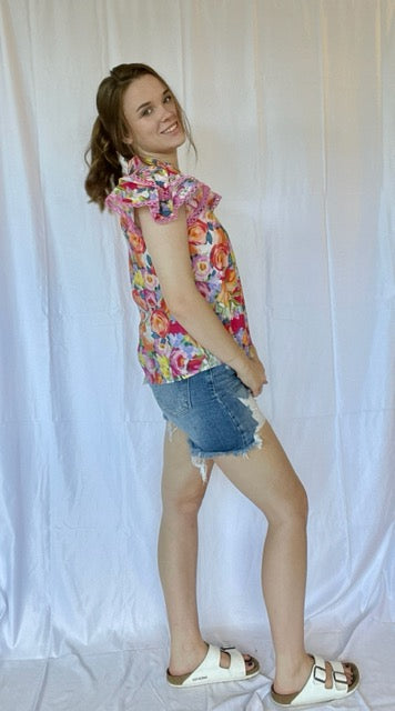 Introducing our Flower Garden Top - a blooming addition to your wardrobe! With its frilled neck, ruffly cap sleeves, and eyelet mesh trim, this floral print top is perfect for any occasion. Plus, the back buttoned closure adds a touch of charm. (P.s. it's the perfect top for a garden party or a picnic)!