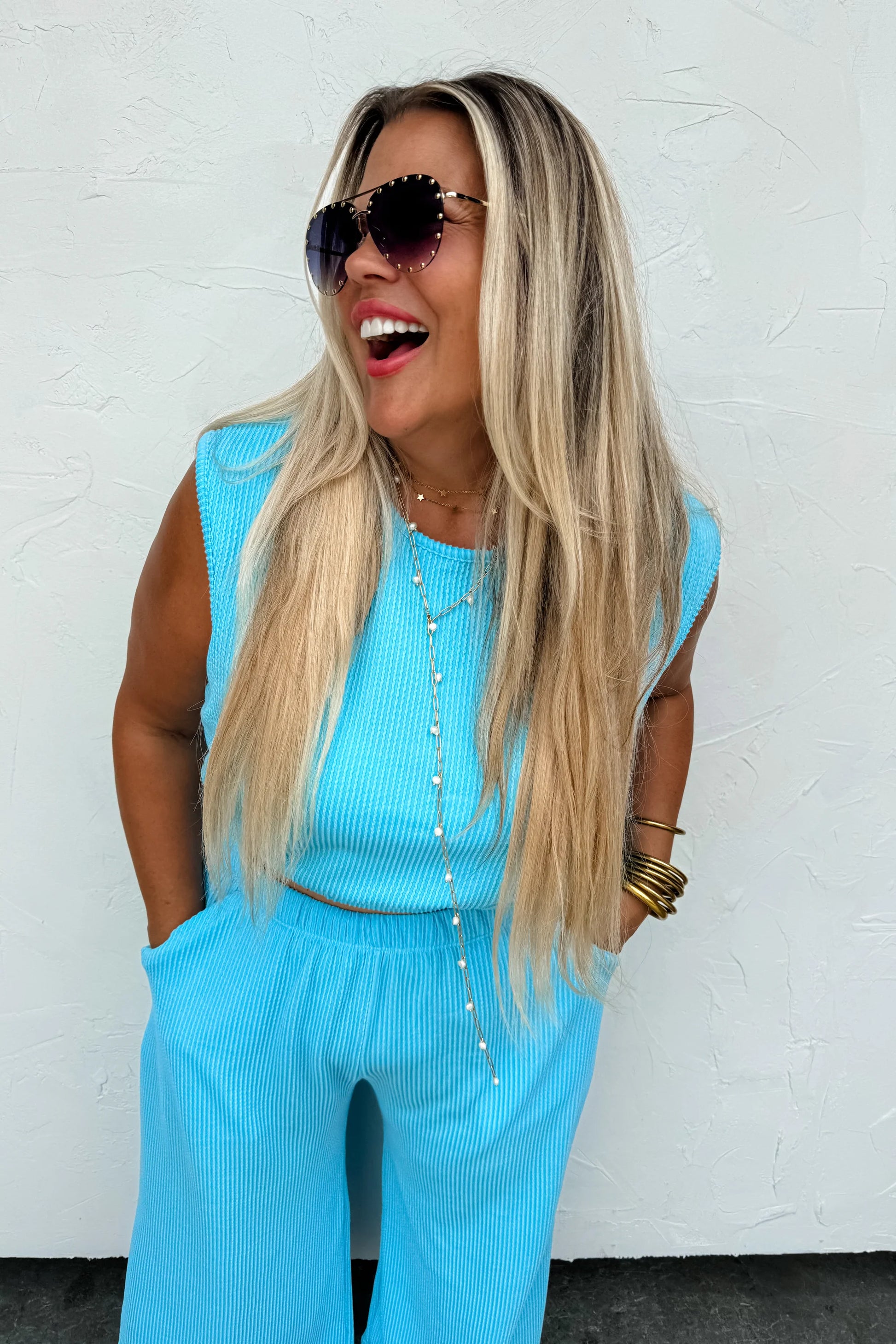 Meet your new go-to outfit: the Maddie Crop Pant Set. Crafted from soft, stretchy, 2-tone ribbed fabric, this set is as cozy as it is stylish. The top features a flattering cap sleeve design and an elastic waistband, giving you the flexibility to wear it cropped to show off your stomach or pulled down for a more relaxed fit. The matching pants offer a comfy elastic waist and feature drapey, flattering front pockets that add a chic touch to the relaxed silhouette.