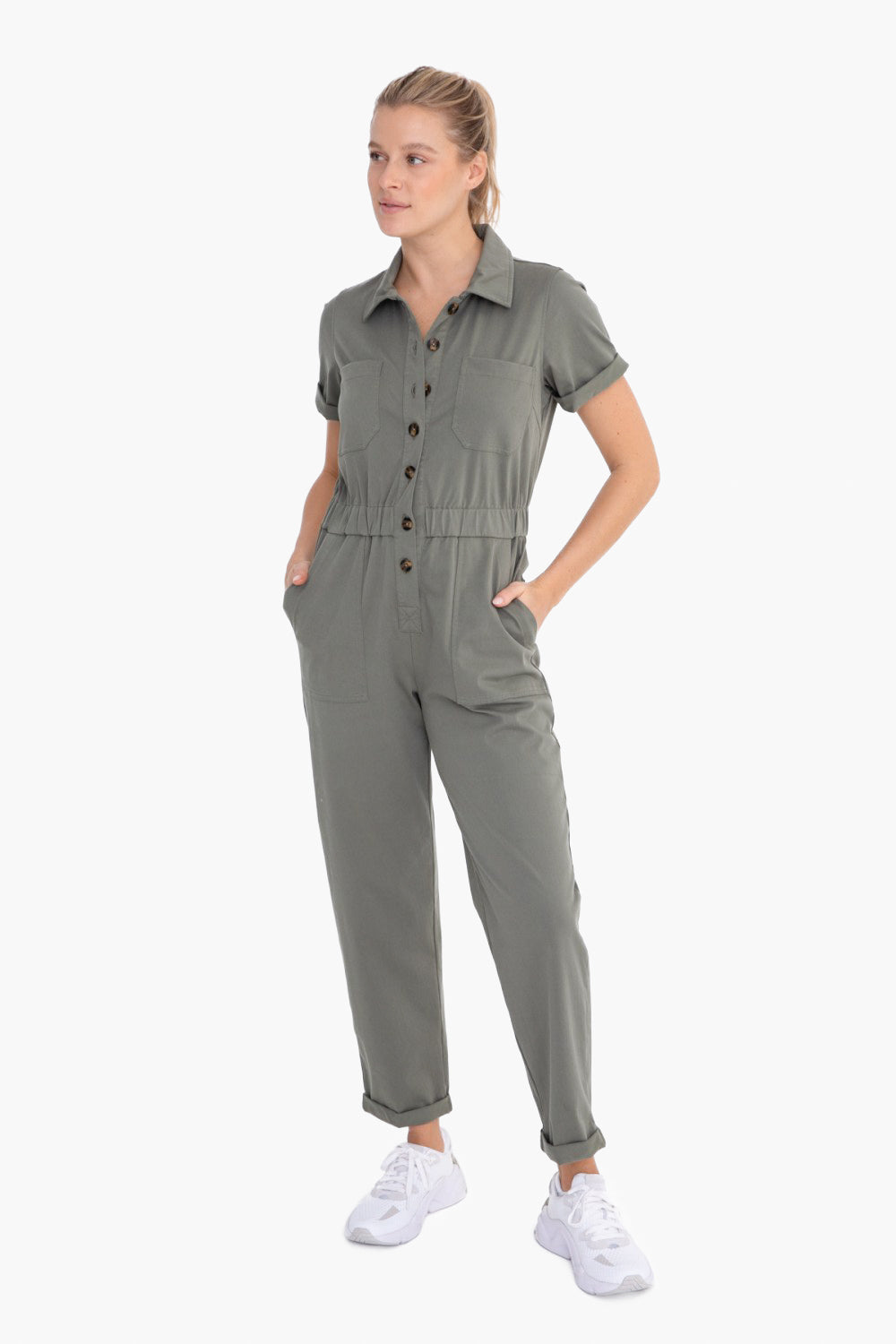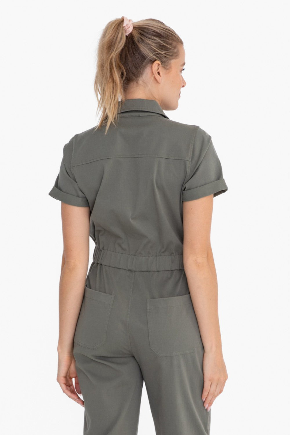 Slip into something a little more comfortable - or stylish - with the Maverick Utility Jumpsuit. This work-wear inspired one-and-done piece takes your style game to the next level with a front button placket, side slant pockets, chest and back patch pockets, elastic waistband for shape, shorts sleeves with rolled cuffs, a collared neck, and a straight leg fit. Rock the look and get ready to turn heads!
