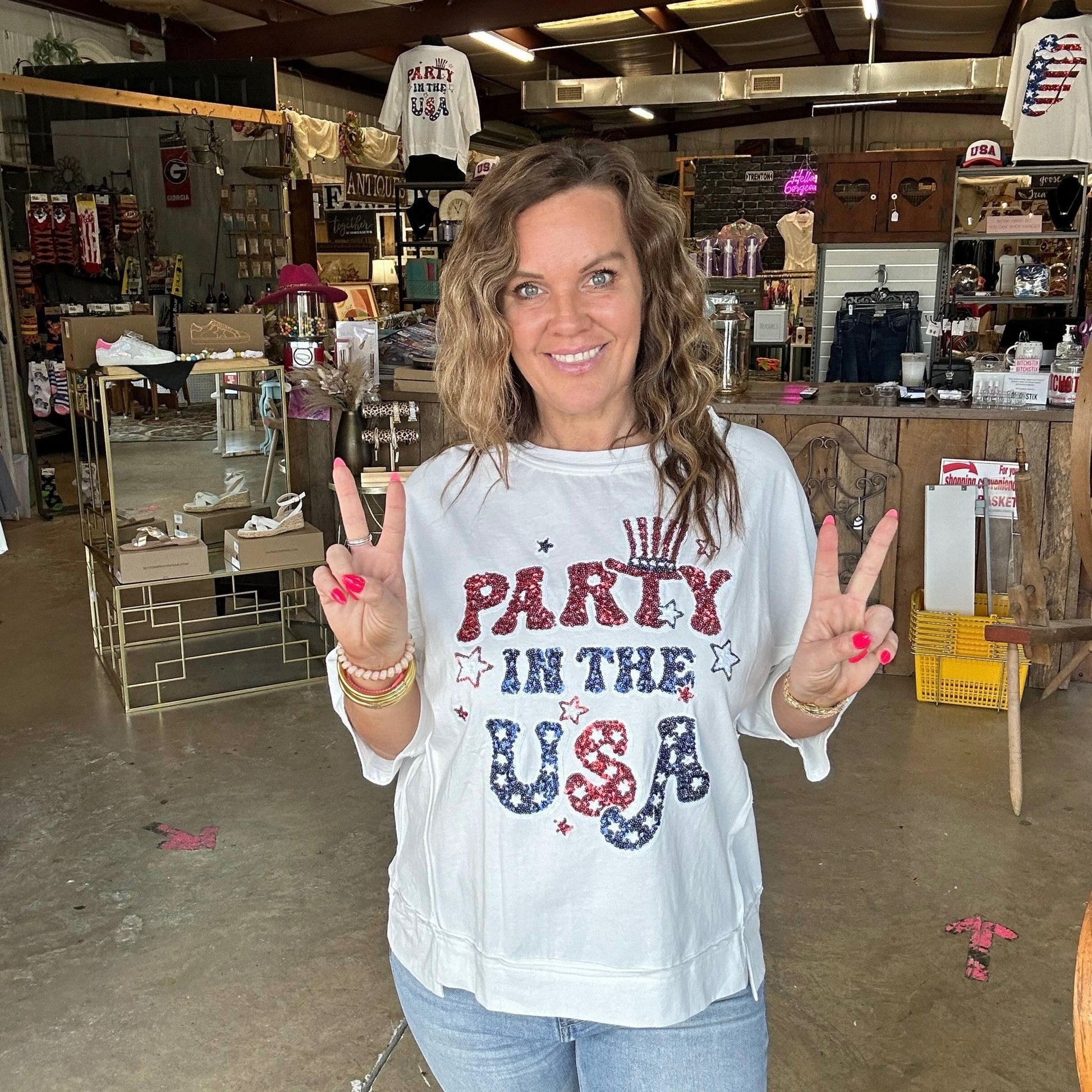 Get ready to party like it's 1999 with the Party In The USA sequin oversize t-shirt from Peach Love! Shimmer and shine in this fun and playful top, perfect for any celebration. With its oversized fit and sequin embellishments, you'll be the life of the party!
