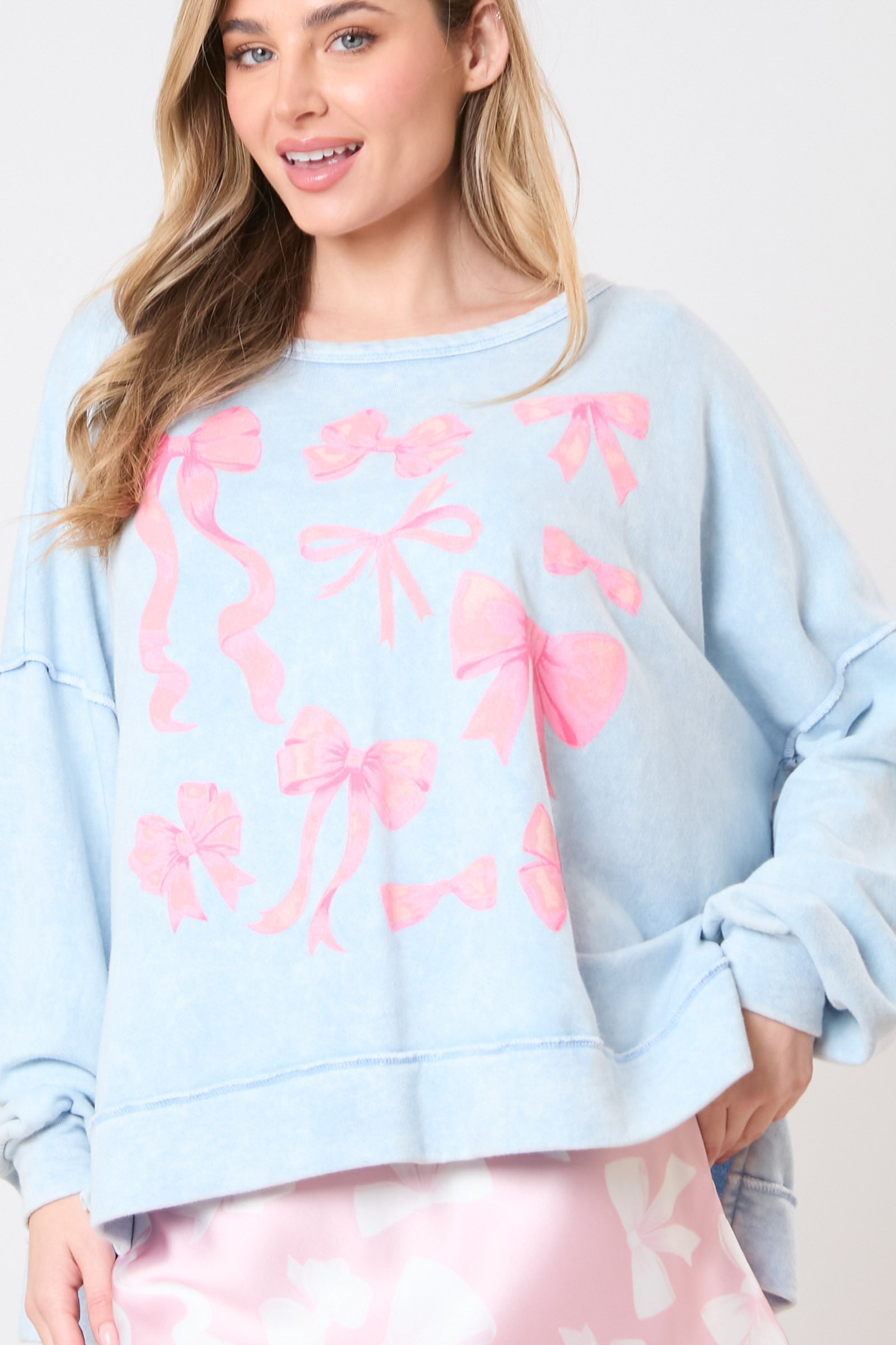 Add a touch of whimsy to your casual wardrobe with the Pastel Bows Mineral Wash Top, proudly made in the USA. This playful piece features a charming ribbon print in soft pink hues on a baby blue backdrop, creating a dreamy, feminine look. Made from a cozy blend of 50% cotton and 50% polyester, it offers comfort and style with its relaxed fit, long sleeves, and a round neckline. The asymmetric high-low cut adds a modern twist, making it perfect for pairing with your favorite jeans or leggings. Whether you're lounging at home or out for a coffee run, this top is your go-to for effortless style.
