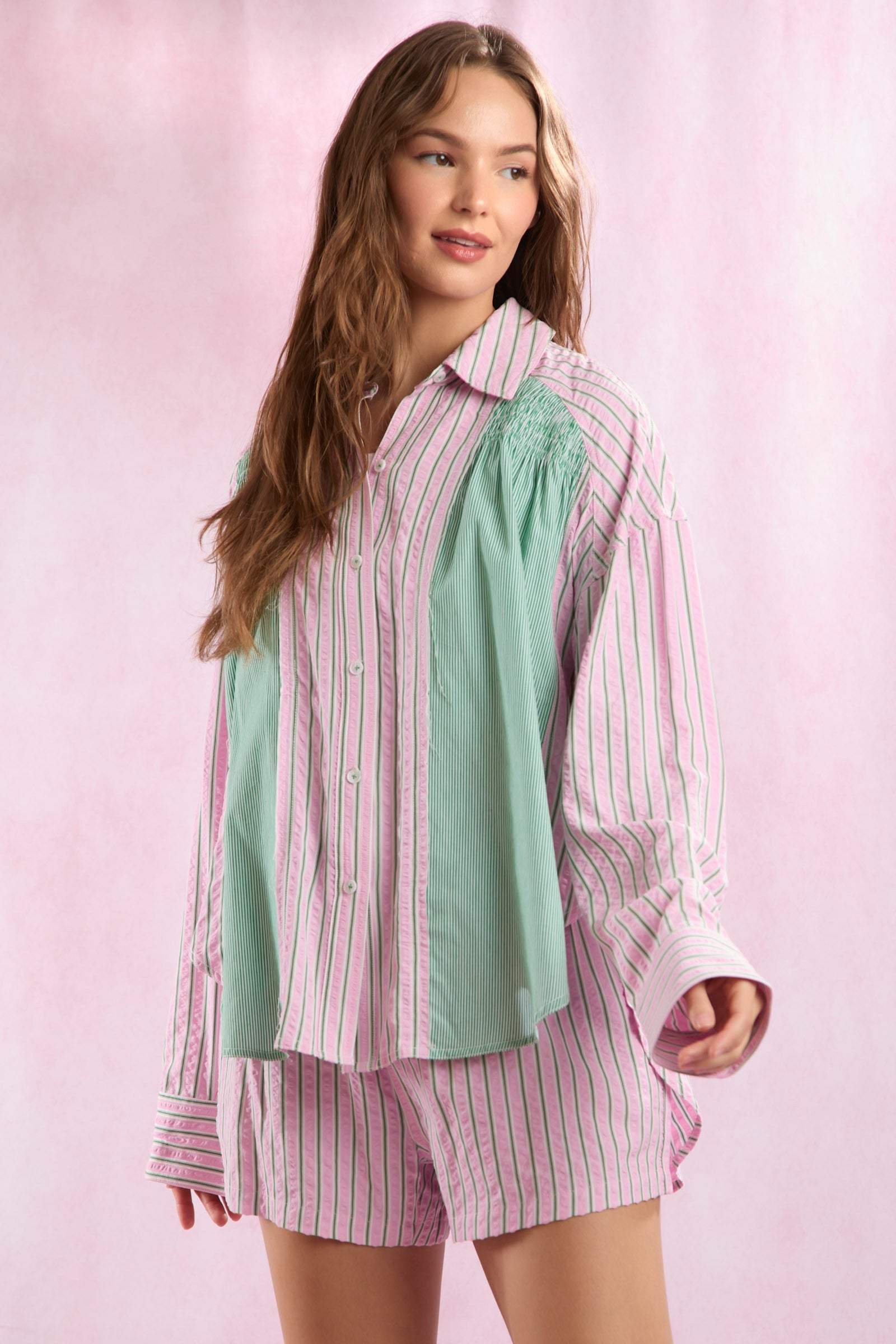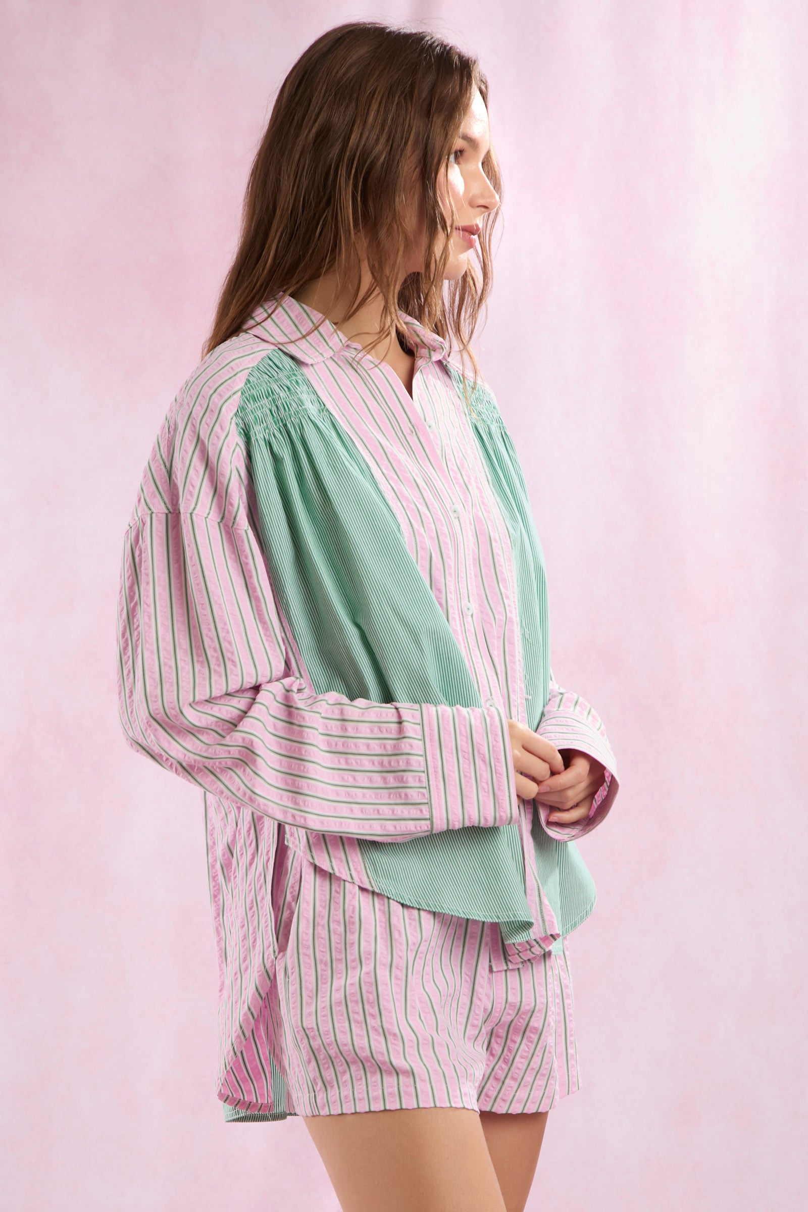 Bring a fresh, vibrant touch to your wardrobe with the Pink Meadows Stripe Detail Shirt. Featuring a beautiful blend of pink and green stripes, this shirt is designed with delicate shirring details that add texture and flair. The soft, breathable fabric ensures all-day comfort, while the unique stripe pattern and subtle ruching create a flattering silhouette.