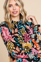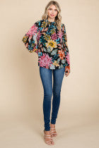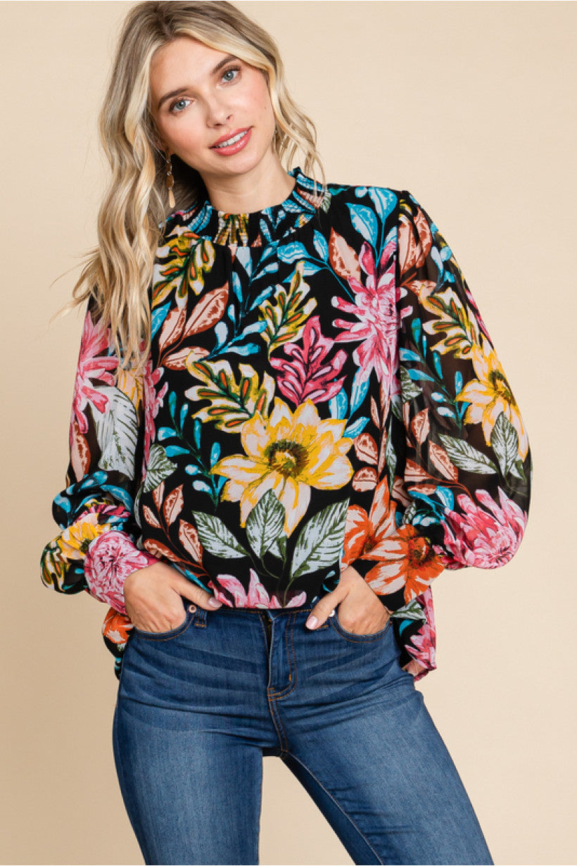 Brighten up your wardrobe with this cheerful Pretty in Flower Long Sleeve top. The beautiful flower print smocked neckline chiffon fabric is airy and light, with lined long sleeves and buttoned cuffs. Perfect for sprucing up any outfit!
