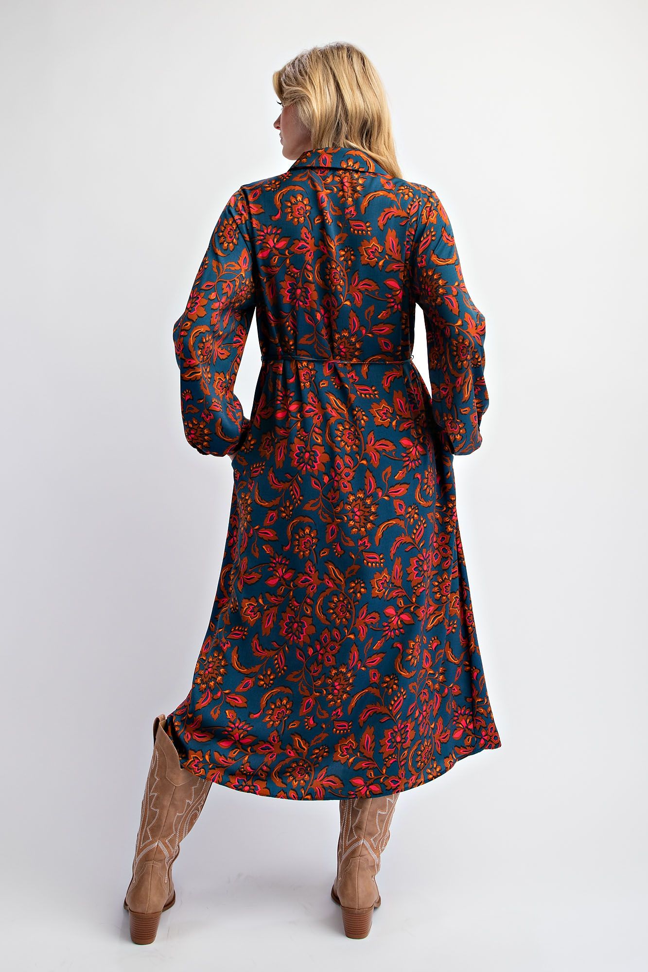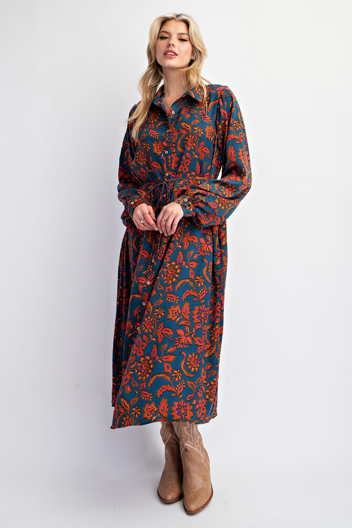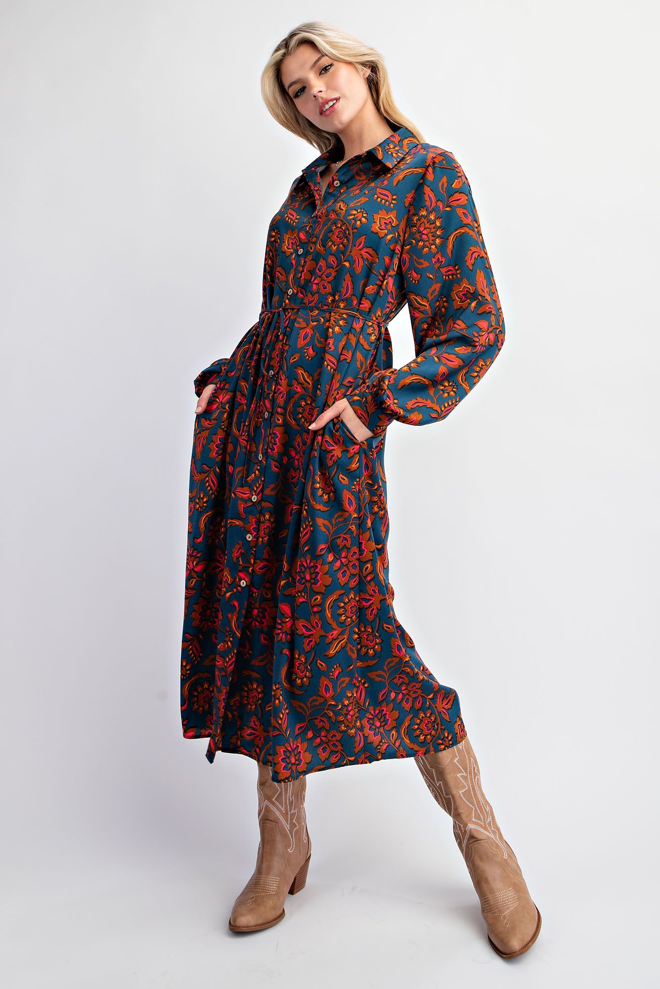 Featuring a classic collared neckline and a button-down front, this dress blends structure with a laid-back vibe. The long sleeves with barrel cuffs and side pockets bring a hint of practicality, while the self-waisted adjustable drawstring lets you define your shape for the perfect fit. With its loose and relaxed fit, The Botanical Breeze Dress is the ultimate in easy, breezy sophistication.