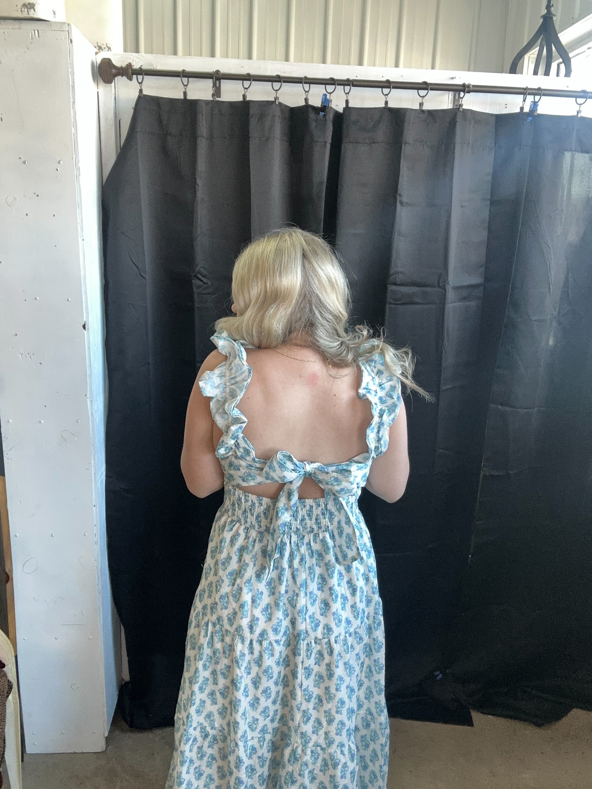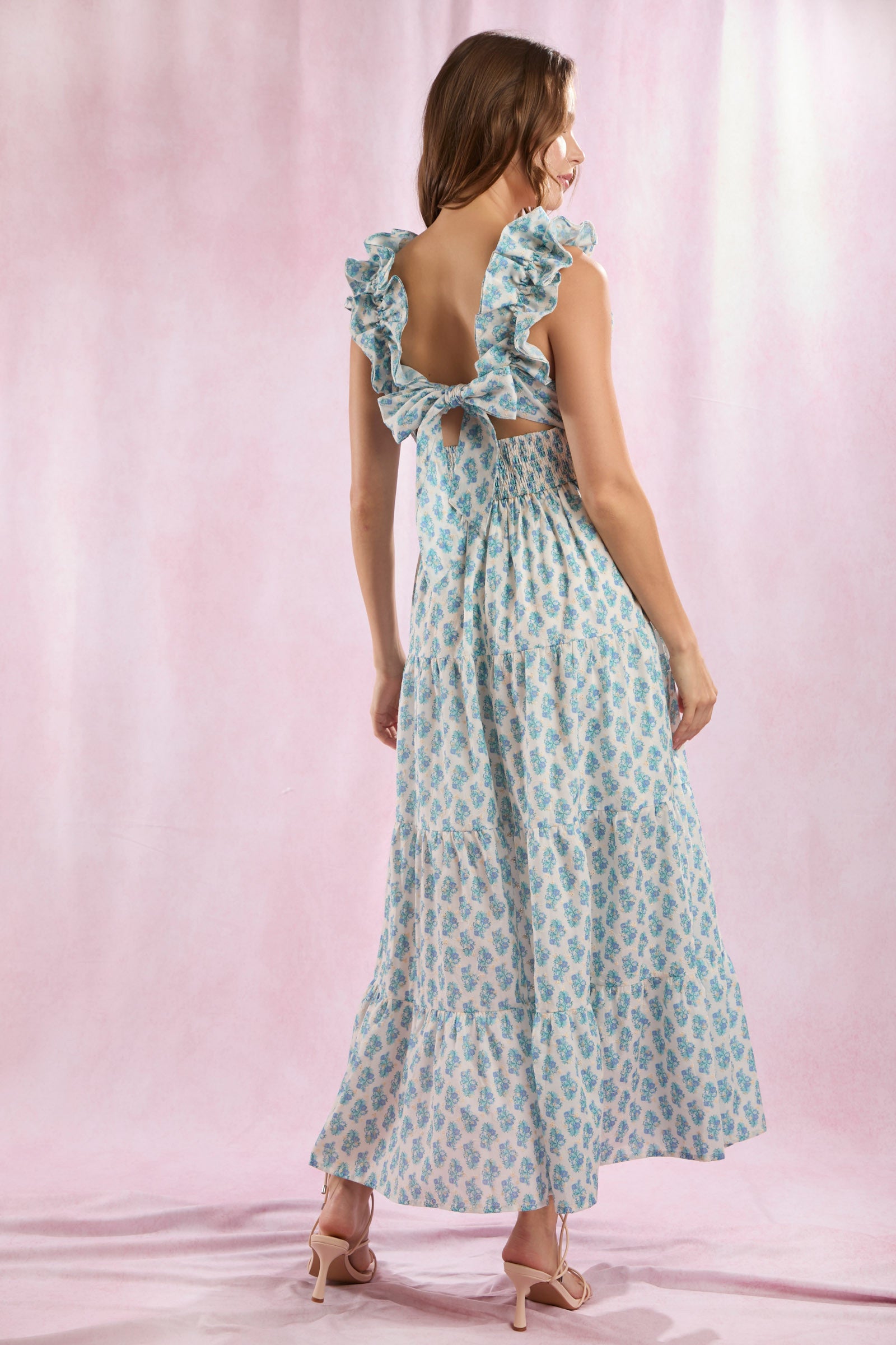 - Design: Floral Print, Ruffle Sleeves, Tied Back, Tiered Maxi Style